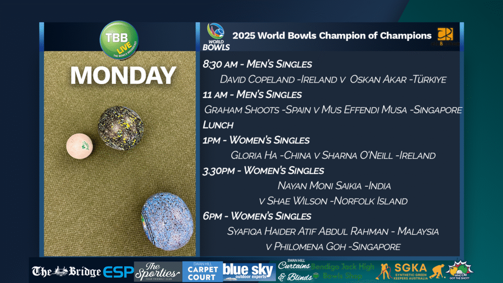 TBB will join World Bowls for the second day. The broadcast will begin at 8:30 am with Men’s Singles David Copeland -Ireland v Oskan Akar -Türkiye.