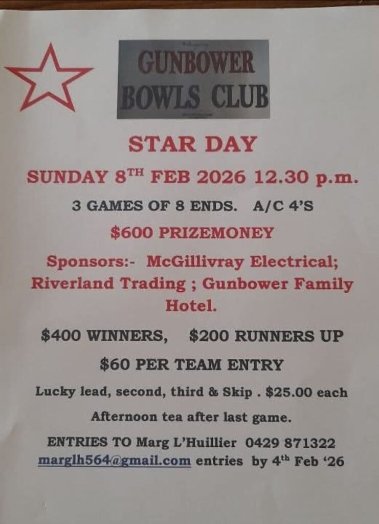 Gunbower Star Day 2 February February 3, 2026 By KJ Less than 1 min. read Gunbower Bowls Club Latest articles Wakool 3 Bowl Triples on Sunday Broadcast News February 20, 2026 NDPA Men’s State Triples 2025-26 Broadcast News February 12, 2026 Tocumwal | Fours 3 March February 11, 2026 Cohuna Bowls Club | Autumn Tornament | Pairs, Fours 3 March February 11, 2026 Related articles Wakool 3 Bowl Triples on Sunday Broadcast News February 20, 2026 NDPA Men’s State Triples 2025-26 Broadcast News February 12, 2026 Tocumwal | Fours 3 March February 11, 2026